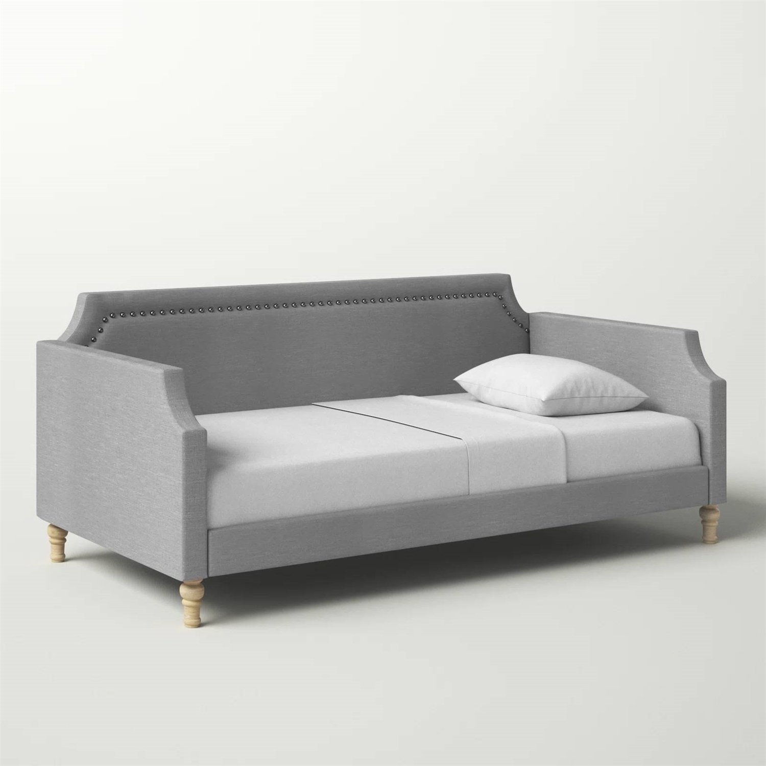 This Twin size Grey Polyester Fabric Upholstered Daybed with Nailhead Trim gives you another spot to sleep, whether it's found a home in your guest room or in your main living area. It stands out thanks to its scooped silhouette on the back and sides, along with traditional turned detailing on its four corner legs. Made from solid and engineered wood, this Twin size Grey Polyester Fabric Upholstered Daybed with Nailhead Trim is wrapped in a neutral-toned polyester fabric that blends in nicely with almost any style, color palette, or pattern. Nail head trim completes the overall look, and a slat kit provides ample support for a twin mattress (sold separately).