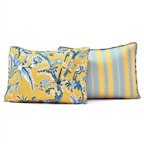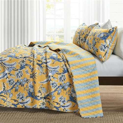 This quilt set will be an excellent enhancement to your master bedroom or guest bedroom. Peacocks, colorful leaves, and flowers adorn the front of this King Size 3 PCS Lightweight Peacocks Polyester Quilt Set in Yellow Blue. This bedding set will be an eye catcher to all who see. You get 2 great looks in one affordable bedding set. The reverse side of this 3 Piece Quilt Set features a classic stripe pattern in the same colors as the front. The simple pattern is perfect on its own or layered with another pattern or solid. This item is OEKO-TEX Standard 100 certified.