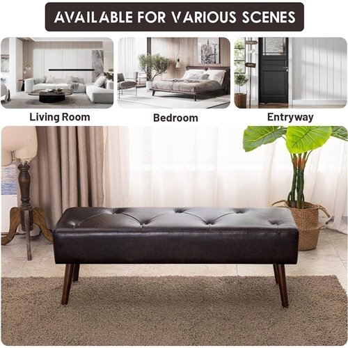 The Mid-Century Bed Bench with Dark Brown Leather Upholstered Seat Solid Wood Legs wrapped in high-quality leather offers ultimate comfort. This unique design is your perfect choice! Generously padded with high-density sponge, the bedroom bench seat is more soft and supportive than an ordinary sponge without collapse. Put your feet up on a leather bench and descend into pure relaxation and comfort. The elegant appearance of the tufted bench for the bedroom can be adapted for most decoration styles, such as the bedroom, living room, dining room, entryway, and also blends with a variety of decor. The dimension of this bed bench is 44.75"D x 15"W x 16.5"H. All necessary hardware and instructions are included in the package. Easy to assemble in minutes. you can put it together and then enjoy sitting. We have established a complete after-sales service system to provide our customers with fast, professional, accurate and enthusiastic technical support and service.