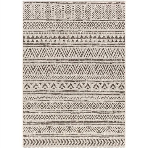 This 5 ft. x 8 ft. Black Off-White Chevron Coastal Boho Style Indoor Outdoor Area Rug grounds your indoor or outdoor space in a Moroccan-inspired print. It features rows of various geometric patterns in black and ivory hues, and it's purposefully distressed for a vintage feel. This rug is power-loomed in Turkey from polypropylene, and it has a low 0.16" pile height ideal for high-traffic areas like your patio, entryway, or living room. Best of all, it's fade- and stain-resistant to stand up to regular use. To care for this rug, vacuum it without a beater bar and spot-clean it as needed.