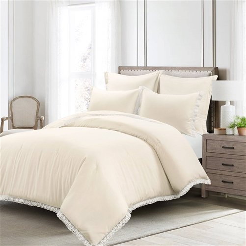 Unwind in style with this Ivory Thin Lace Trim 5 Piece Comforter Set. With its cozy vintage farmhouse charm, this bedding set is simple in design and easy to coordinate and layer for a complete look. The lace detailing adds elegance and a bit of texture to your bedroom design. The lace trim adds lovely flair to an otherwise minimalist look that can also fit into farmhouse, vintage charm, traditional, cottage or French Country themes. This set includes one comforter, two shams and two euro shams. Labeled safe to machine wash and tumble dry.