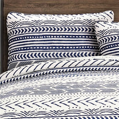 Add a modern Scandinavian style to your bedroom with this 3 Piece Contemporary Blue White Gray Reversible Cotton Set in King Size. The quilt has stripes, chevron, and other geometric patterns. This 3 piece set includes a soft 100% cotton quilt and 2 matching pillow shams. The lightweight cotton quilt is perfect for all seasons. The reversible design gives you two stylish patterns in one set.