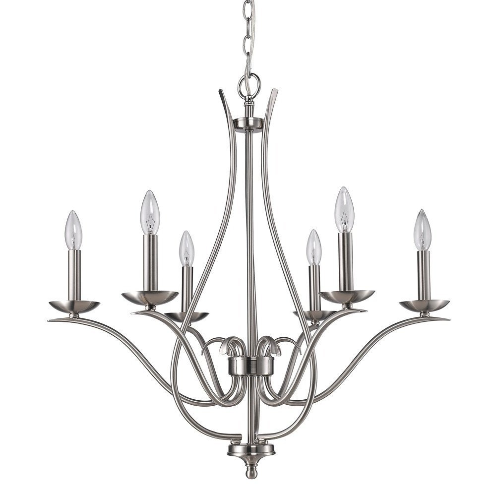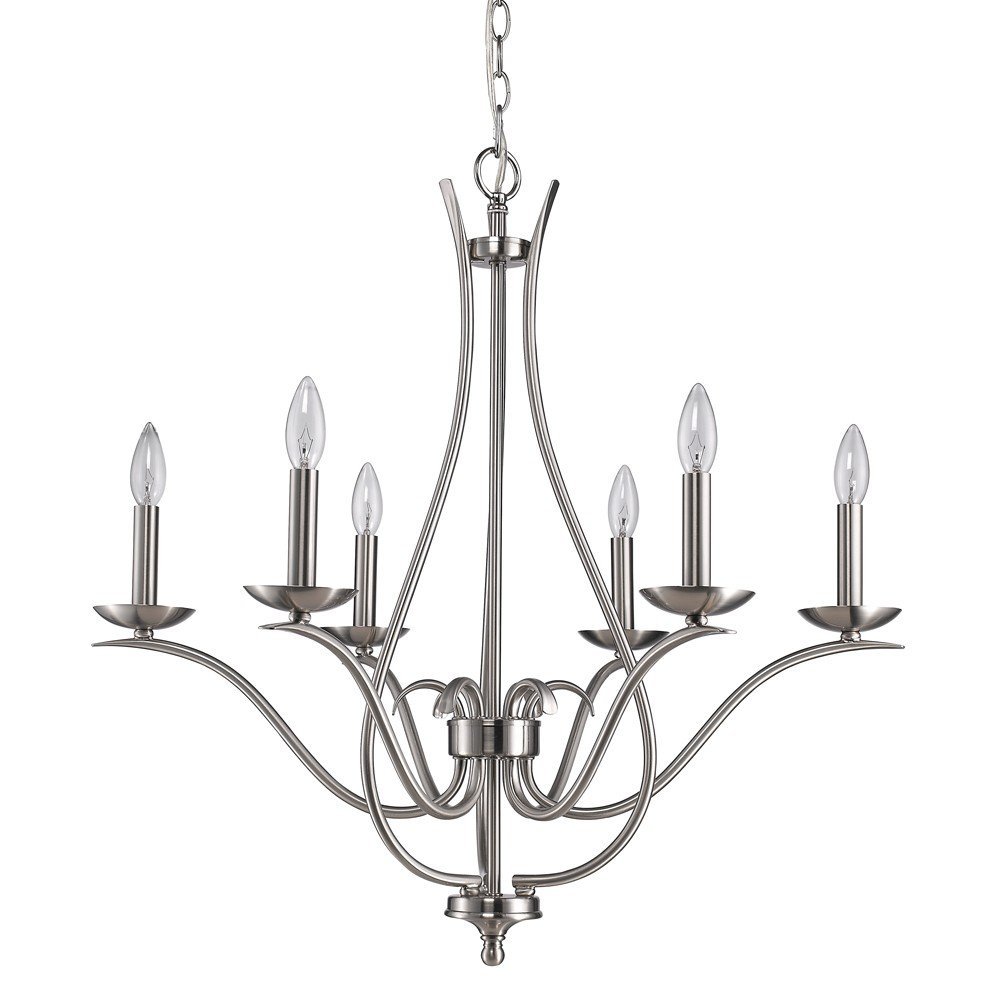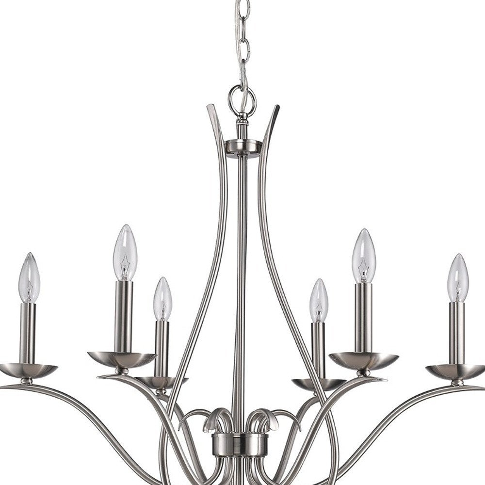 Brighten up your space with this gorgeous nickel candle style six light metal dimmable chandelier. A nickel finish, gives this light a classic and neutral tone to blend into many decor styles. This light will require hardwiring installation. This fabulous hanging light is a great way to add some design and brightness to any space in your home. 28-inch H x 28-inch W x 28-inch D