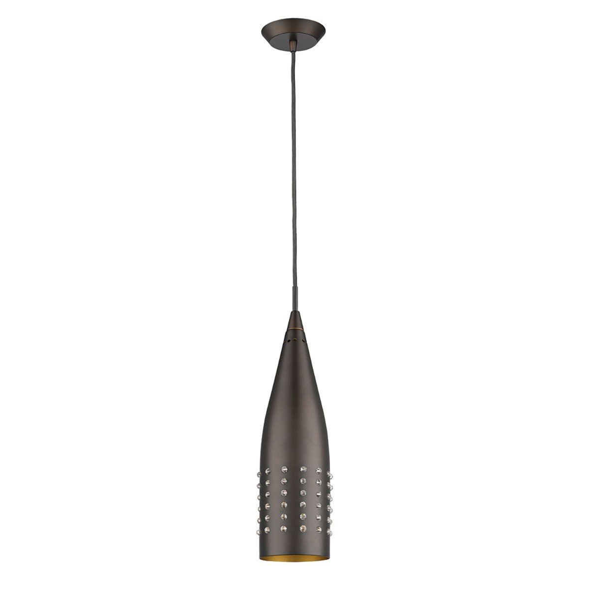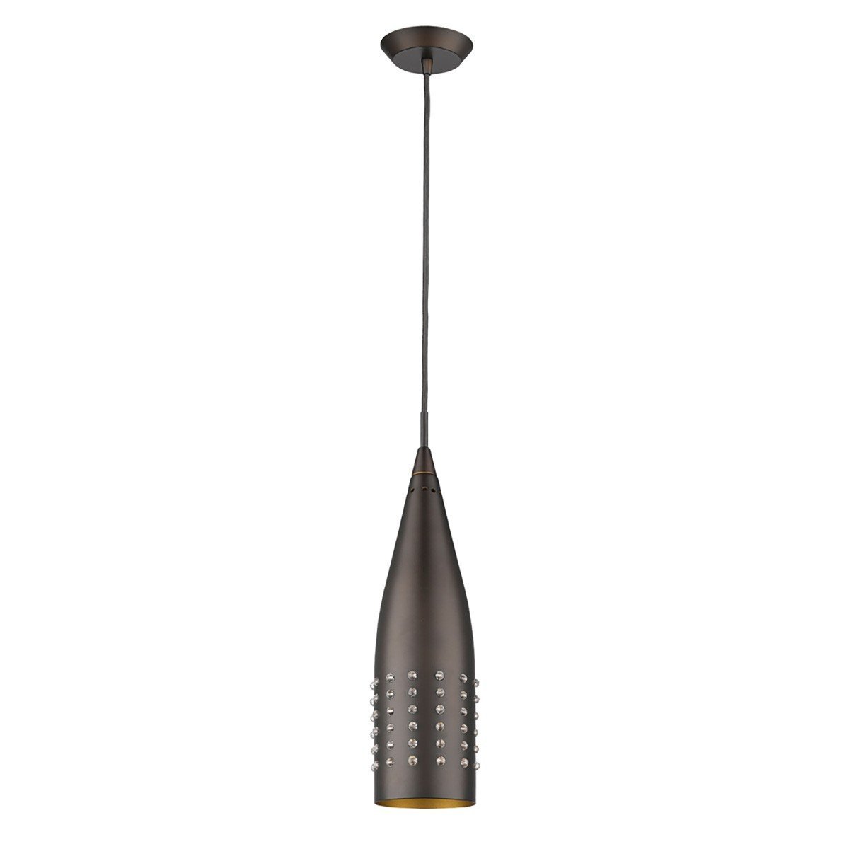 With this Narrow Bronze Hanging Light with Glass Studs you can add a unique light fixture to your home and add a bit more style to the whole space. The ceiling bracket has a simple graduated round design and is attached to a thin taut wire. Both of these are colored to a bronze finish. The wire attaches to the top of the main light. The main light body has a long and narrow upside-down goblet shape. The bronze finish looks great against the inner gold finish. There are four horizontal lines of clear glass studs around the edge which adds a textural element to the overall look. Use this hanging light in your kitchen, your dining room, or your entryway. 10.75" H x 3" W x 3" D