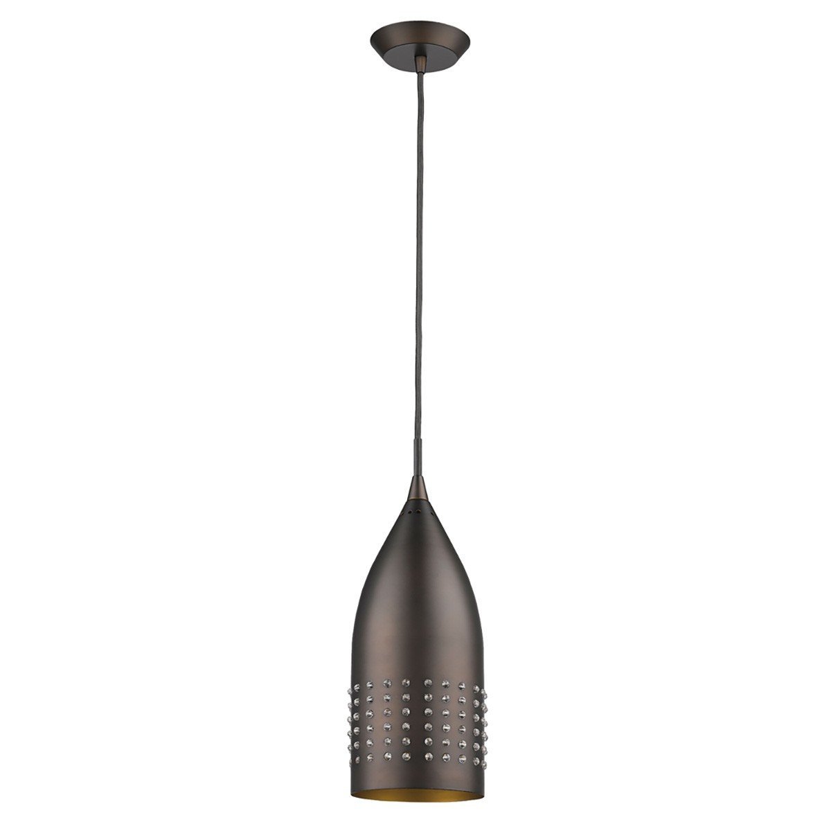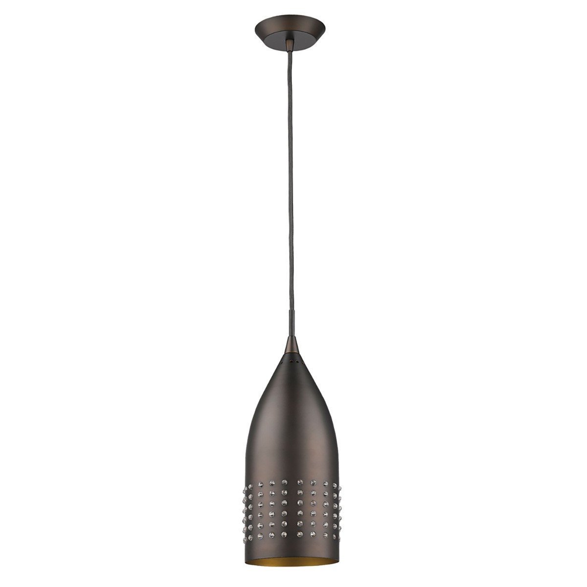 With this Bronze Hanging Light with Glass Studs you can add a unique light fixture to your home and add a bit more style to the whole space. The ceiling bracket has a simple graduated round design and is attached to a thin taut wire. Both of these are colored to a bronze finish. The wire attaches to the top of the main light. The main light body has a wide upside-down goblet shape. The bronze finish looks great against the inner gold finish. There are four horizontal lines of clear glass studs around the edge which adds a textural element to the overall look. Use this hanging light in your kitchen, your dining room, or your entryway. 11" H x 4.5" W x 4.5" D