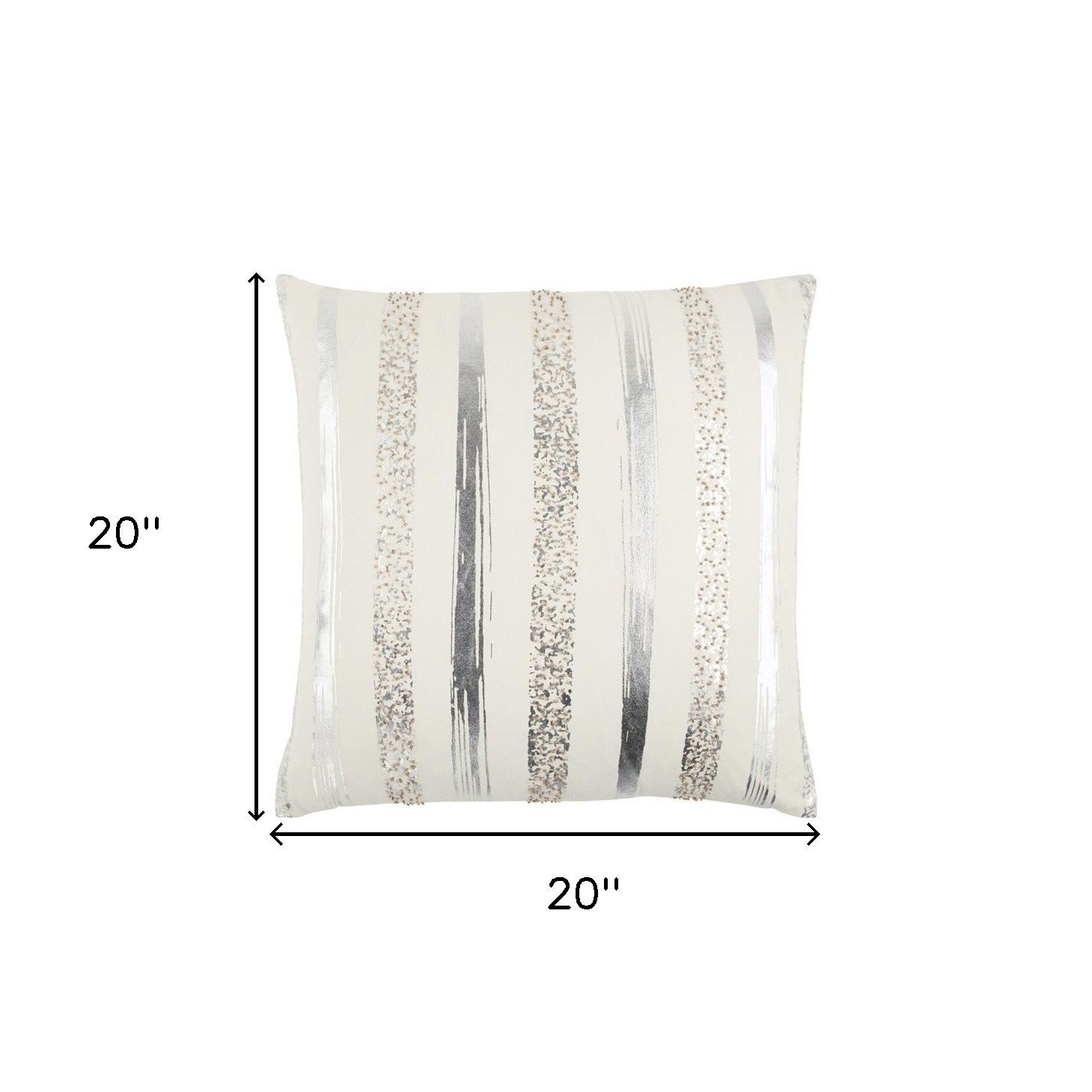 Combining glam and style in a sophisticated modern palette, this Silver and Gold Glam Stripe Beaded Embellished Throw Pillow will be a stylish accent to pair with your contemporary decor. The alternating stripes in silver foil and hand-beaded silver and gold embellishments over the white base give this pillow a dazzling dose of splendor. Being a poly-filled pillow, it does not compromise the plush and fluffy nature while the knife edge keeps all four corners sharp and clean to adorn the pillow with a polished look. The solid coordinating back with a hidden zipper closure offers a seamless finish and provides hassle-free cleaning. Enrich your rich decor of the living room with this gorgeous and glamorous throw pillow to be perfectly suited with a variety of vibrant themes and styles. 20” x 20” x 6.25”