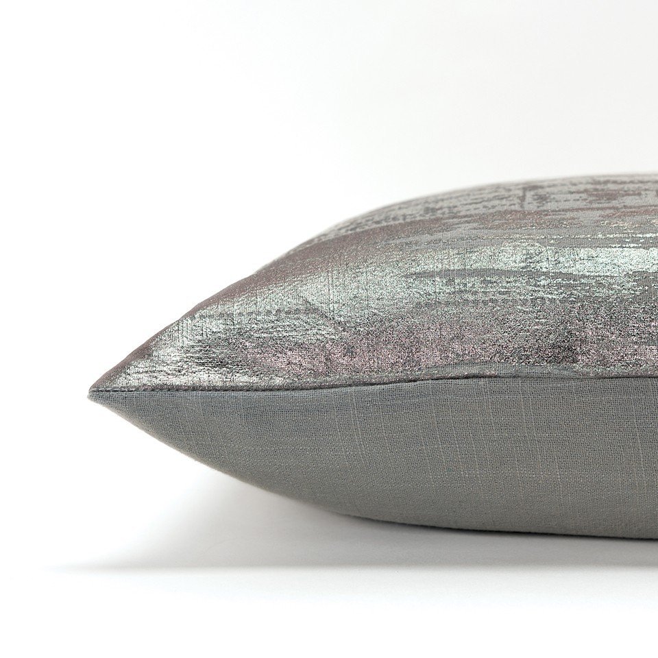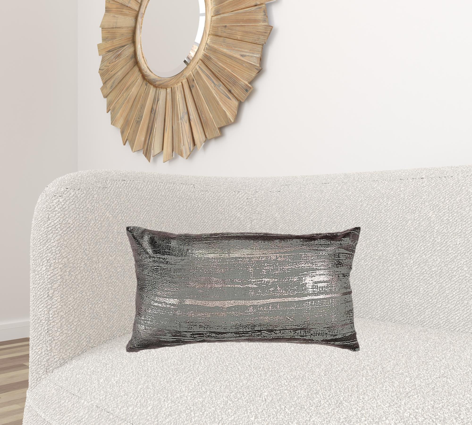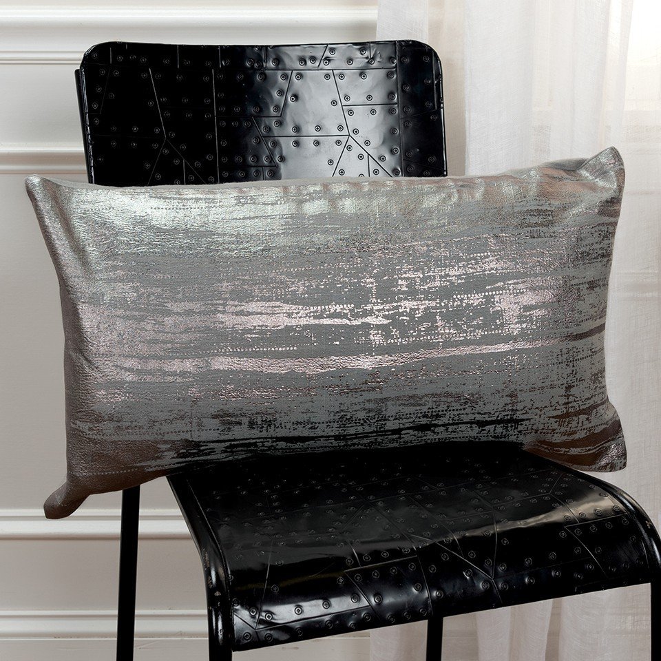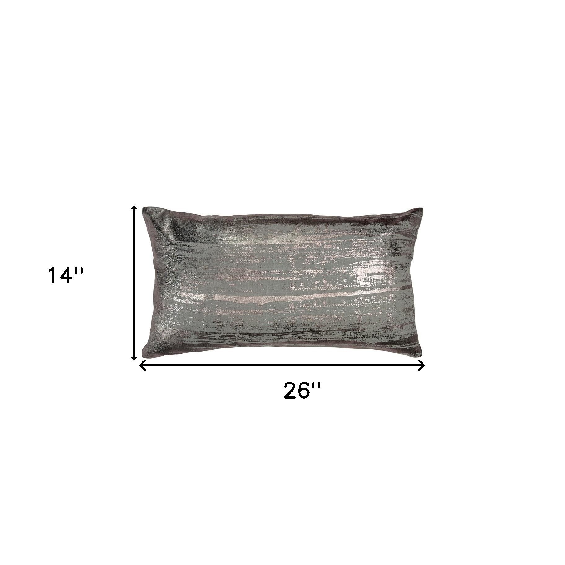 Bring a glamorous tone to your modern home with this Silver Distressed Brush Stroke Lumbar Pillow that strikes the perfect hues to accentuate a contemporary style with a vintage flair. The lilac base with horizontal brushstrokes of silver-toned foil creates a distressed appearance with a slight sheen, making this pillow an ideal fit for any retro-modern home. Crafted from lightly textured cotton slub fabric to not only ensure long-lasting durability but also give this pillow a nubby surface texture for an inviting feel on the touch. This luxurious lumbar pillow has a knife edge that makes the corners look sharp and polished while the solid matching back has a hidden zipper closure for ease of cleaning. Simple and sophisticated with a soft sheen, this decorative lumbar pillow is sure to draw the eyes and bring a sense of luxury to your modern living space. 26” x 14” x 6.25”