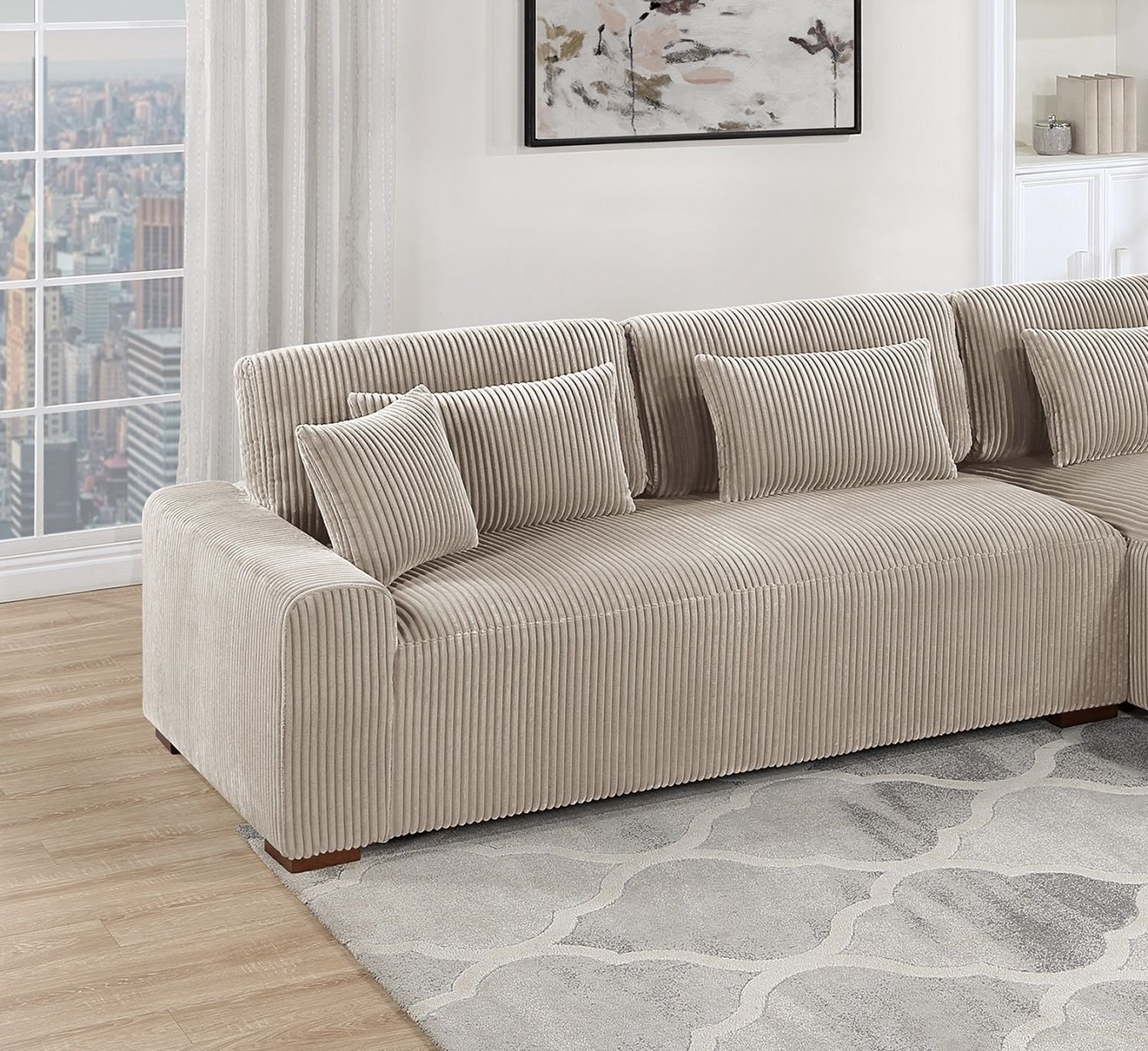 Whether you're hosting a movie night with friends or simply unwinding after a long day, this 2-Piece Sectional Set offers the perfect combination of style and comfort. The plush corduroy fabric is luxuriously soft and inviting, perfect for creating a warm and cozy atmosphere in your living room. Featuring clean lines and a modern silhouette, perfect for complementing any living space. The squared arms add a touch of sophistication, while the low-profile legs create a sleek, contemporary look. The attached seat cushion streamlines the design and provides a smooth seating surface. This set comes complete with five accent pillows mix and match the pillows to create a look that reflects your unique taste.