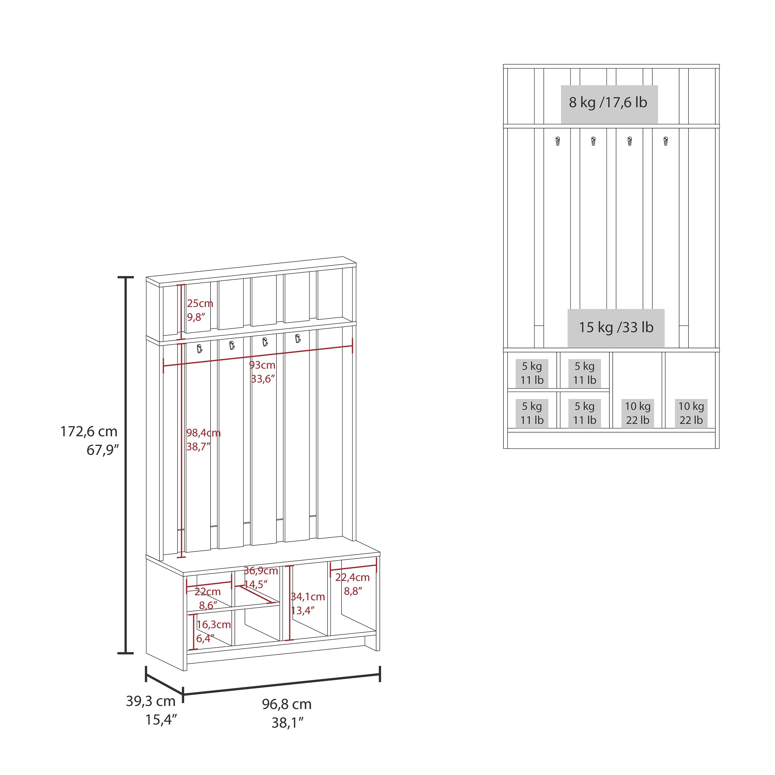 Perfect size: Its dimensions of 38" Wide x 68" High and 15.4" Deep are great to accommodate this Hall Tree in any type of space