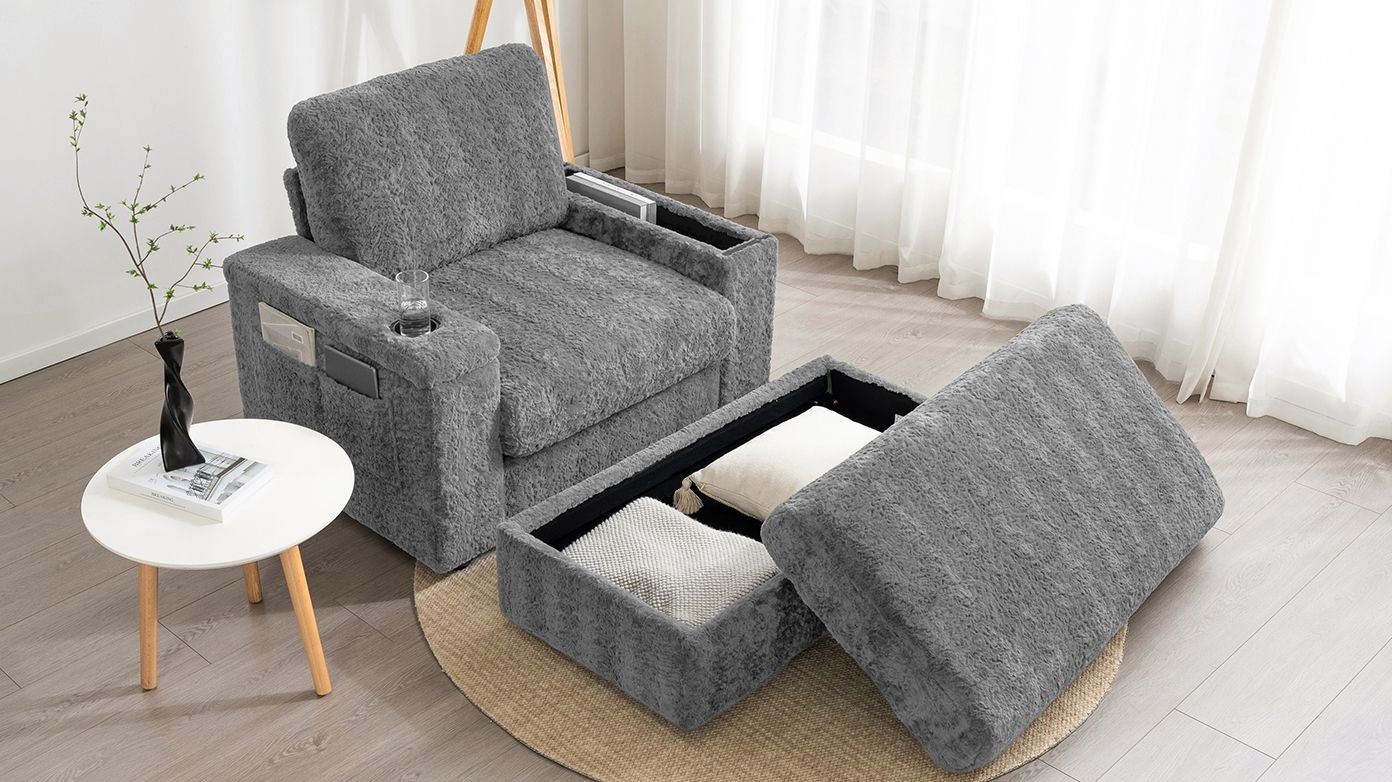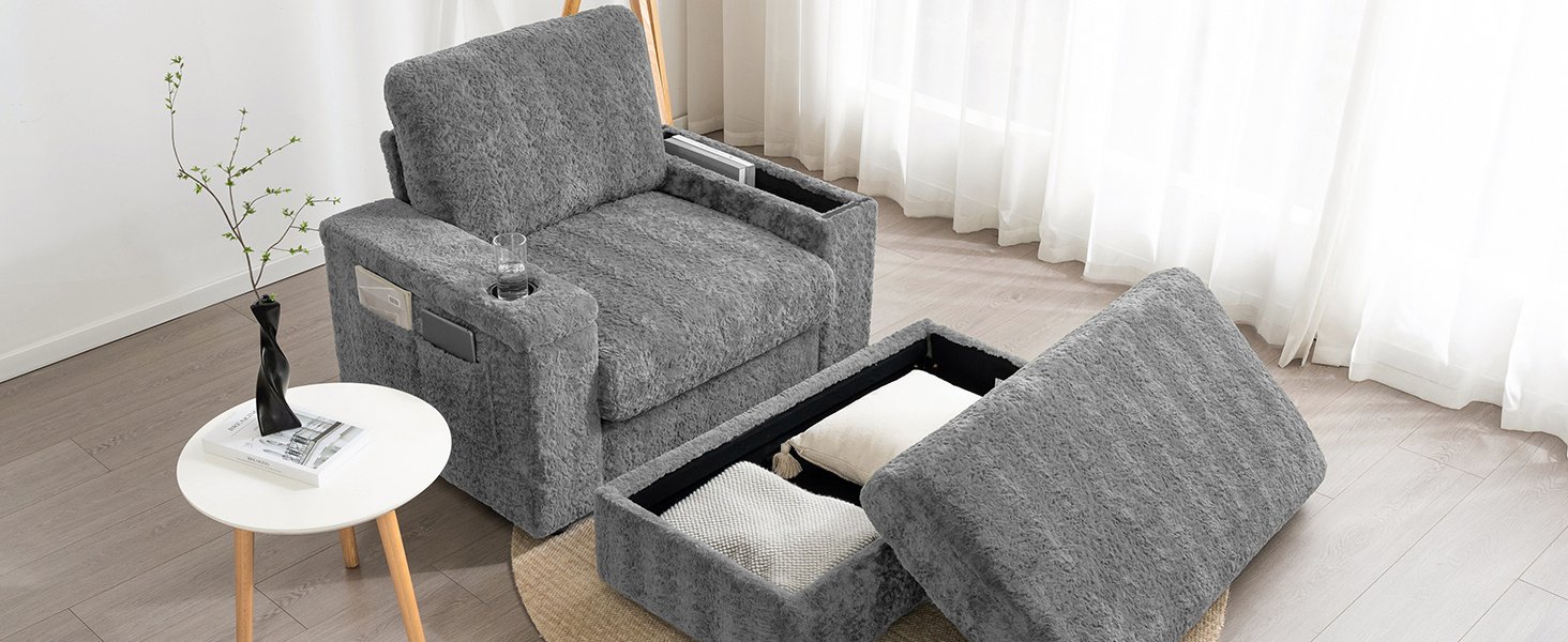 Hidden Armrest Storage Compartment + Dual-Sided Storage Pockets: One of the standout features is the hidden storage compartment within the armrests. This clever design allows you to store small items like remote controls, phone chargers, or magazines out of sight but still easily accessible. In addition, there are dual-sided storage pockets attached to the sides of the furniture, offering even more space to organize everyday essentials like books, remotes, or snacks.