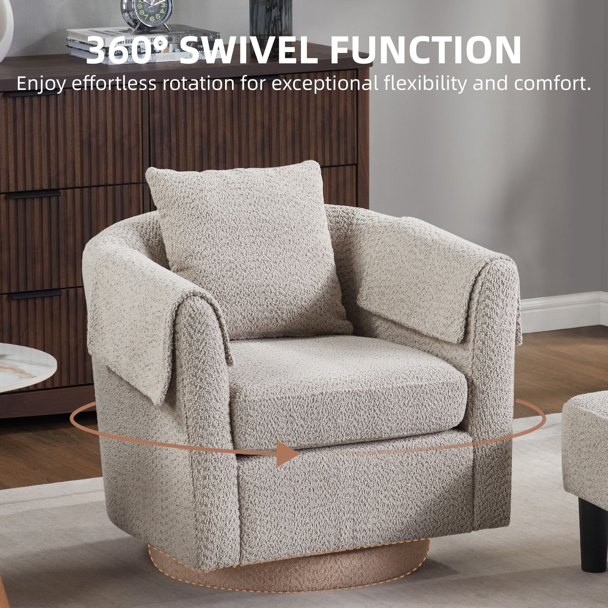 This 360° swivel accent chair with an ottoman set is a stylish and comfortable addition to any living space. The chair is crafted with a soft chenille fabric that feels luxurious. It features armrests and comes with a back pillow for added comfort.