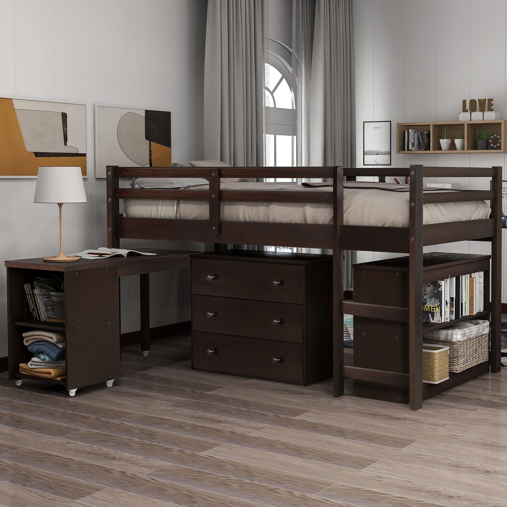Crafted with high grade manufactured pinewood; enjoy the Loft bed in the shades espresso; gray and white to match the color scheme of any room. Designed with a loft structure; enjoy the space underneath used to house storage drawers and a portable desk fitted with base wheels. When the desk is needed; simply roll it out from under the loft for more workspace and an instant engaging underside fort area for your family to play in and let their imagination run wild. Three underside storage drawers coupled with a two-tier bookshelf provide plenty of storage options for you to help keep space tidy and organized. The built-in three rung ladder provides easy access to the twin sized bed featuring full length safety guardrails.